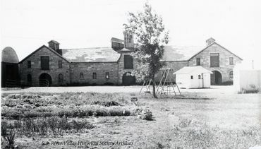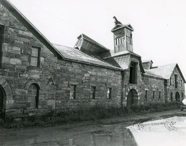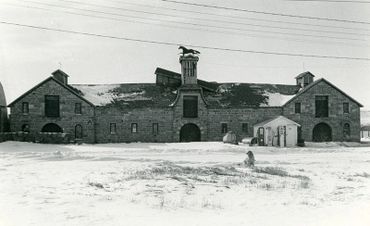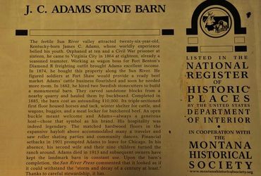 The J.C. Adams Stone barn dates to 1885 and it is unique in its size and romanesque revival stone construction. Built at a cost of $10,000, cattle rancher J. C. Adams hired two swedish immigrant stonemasons to help construct it. The single piece stone arches for the barn were imported from St. Louis, Missouri, and shipped by steamboat to Fort Benton. When it was completed, the Sun River Press newspaper called it the "Marvel of Montana". The barn is 140 feet long and 40 feet wide, and is topped with a life sized horse weathervane. The original weathervane is on display in Fort Benton, Montana and a replica now sits atop the barn.