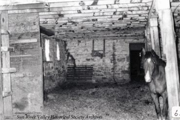 The main section of the barn was used to house cattle. The west wing contained horse stalls and a tack room. The east wing was used as a garage for storing wagons, and had a cooled room for holding dressed meat. When the barn was completed, Adams held a roller skating party in its massive loft and it quickly became a showcase for the Sun River valley.